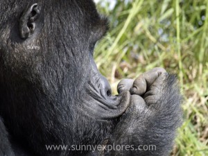 The baby knows all his family looks out for him. He is cheeky towards the big Silverback and the young males. He hits one of the males, tries to impress him, but when the male looks at him he hides his eyes behind his hands, like he is not there. A toddler would do the same! Then his mother calls him. Playfully he rolls down the mountain and bumps into his patient mom. Our whole groups laughs: we feel so privilegd that we can experience this. We are moved: our souls are touched by the recognition that we feel. These apes are human. Unfortunately we are only allowed to stay with them for one hour. After that they get their rest. This Nkuringo group serves as an ambassador for their species. For one hour a day they are disturbed by tourists who pay a lot of money for this visit. With the proceeds of these gorilla permits rangers are paid to protect the mountain gorillas against illegal poaching. I can only hope and pray they are able to to protect the last 769 gorillas that are left. They are no apes, they are human.