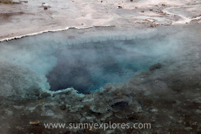 Geysir gave its name to the natural phenomenon, to geysers all around the world. Geysers originate in deep vertical pipes, which are full of water. The water on the bottom comes into contact with hot rocks and starts to boil. This causes the water to expand and rise. The cold water on the surface forms a kind of lid that stops the water until the pressure becomes too much and the water spouts upwards. At the Strokkur, at the moment the most impressive geyser, this lid is clearly visible.